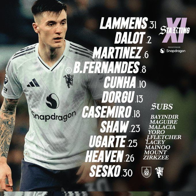 曼联首发:31-拉门斯、6-利桑德罗-马丁内斯、26-艾登-海文、13-多古、23-卢克-肖、25-乌加特、18-卡塞米罗、2-达洛特、8-布鲁诺-费尔南德斯、10-马特乌斯-库尼亚、30-谢什科