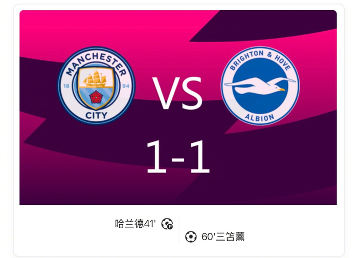 【战报:曼城1-1布莱顿,哈兰德点射破纪录】上半场多库造点,哈兰德点射破门;下半场三笘薫低射扳平比分。经过激烈的角逐,两队未能分出胜负,最终曼城与布莱顿1-1握手言和。