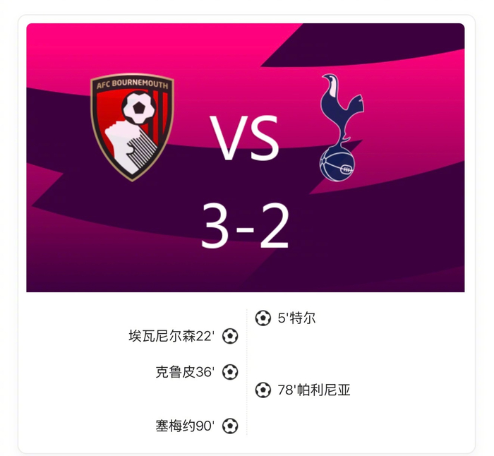 【战报:#伯恩茅斯3比2热刺#,帕利尼亚倒钩塞梅约绝杀】上半场开场不久特尔凭借个人能力内切破门取得开门红,随后埃瓦尼尔森头槌扳平比分,克鲁皮破门反超比分。下半场帕利尼亚惊天倒钩扳平比分,贝里瓦尔、本坦库尔伤退。补时阶段,塞梅约远射破门绝杀。凭借塞梅约、埃瓦尼尔森、克鲁皮的进球,伯恩茅斯3-2战胜了托特纳姆热刺。