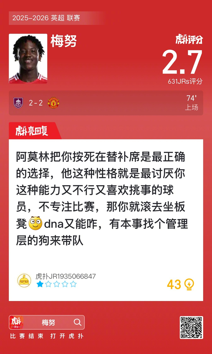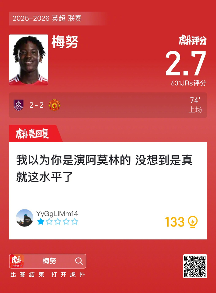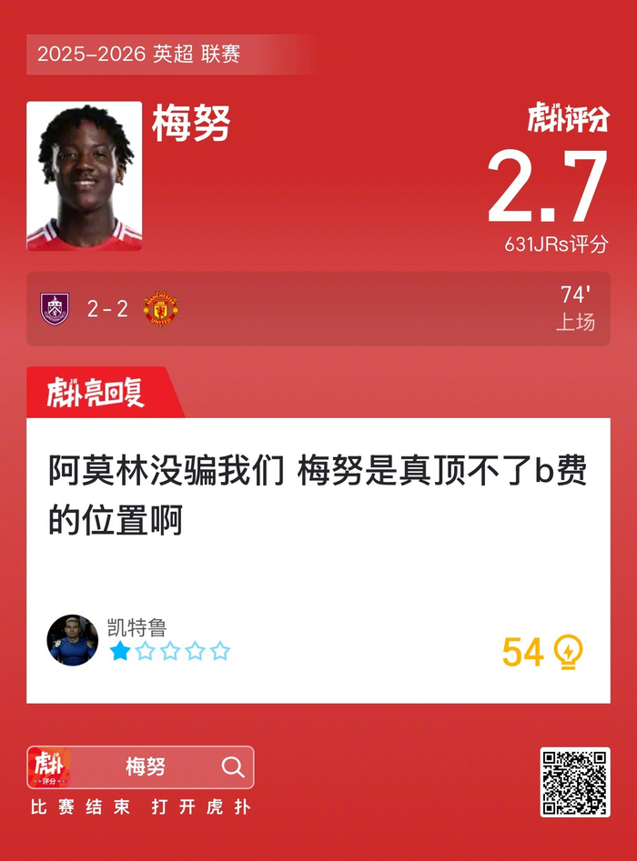 #伯恩利2比2曼联#梅努赛后收获2.7的虎扑评分!