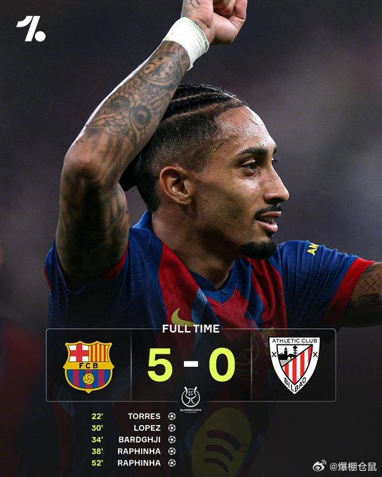 【西班牙超级杯半决赛,#巴萨5比0毕尔巴鄂竞技#】费兰-托雷斯,费尔明,巴尔德吉破门,拉菲尼亚梅开二度,巴萨5球大胜,决赛对阵皇马vs马竞的胜者。
