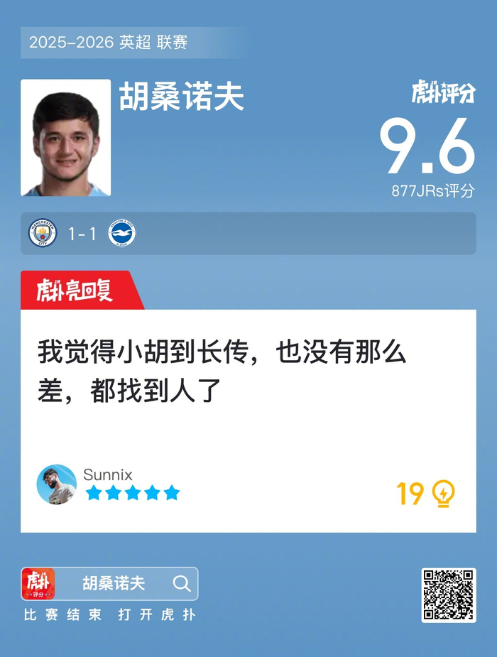 #曼城1比1布莱顿# 胡桑诺夫赛后收获9.6的虎扑评分!