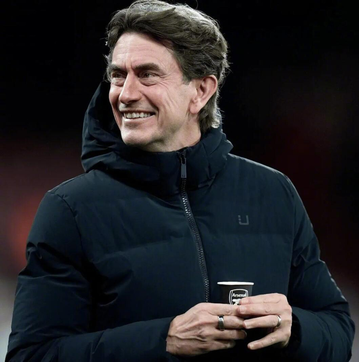 他端着阿森纳的杯子准备喝水,表情看上去比较开心。