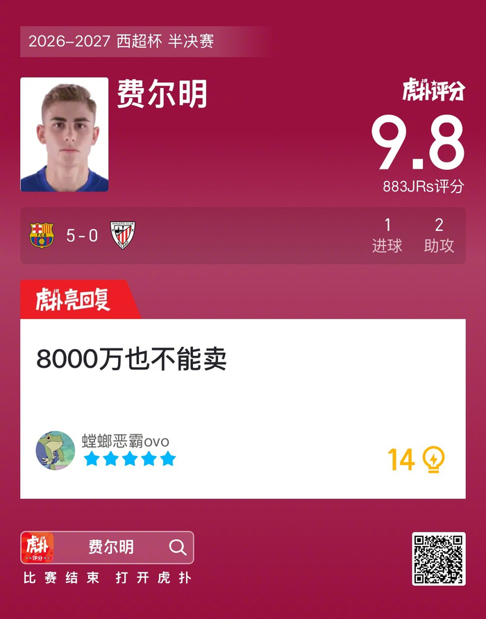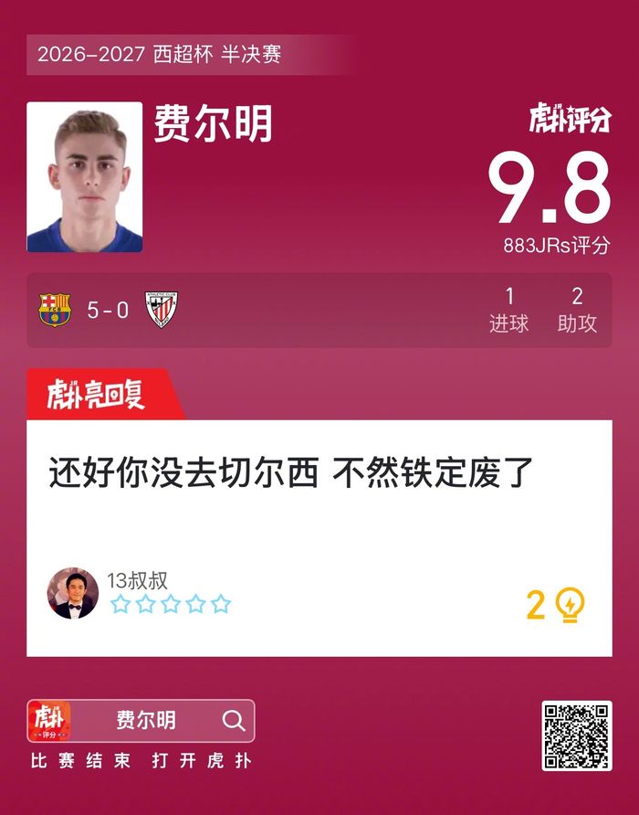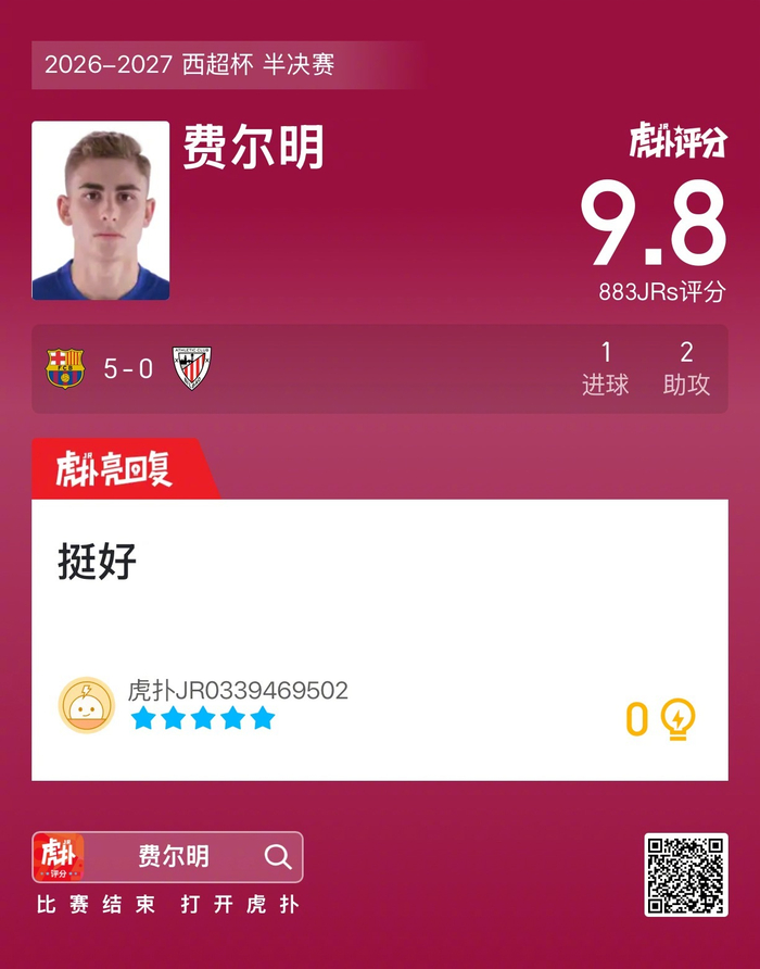 #巴萨5比0毕尔巴鄂# 费尔明打进一球,贡献一次助攻,赛后收获9.8的虎扑评分!