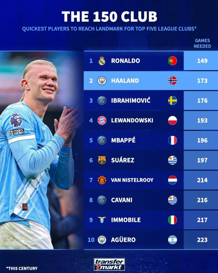 德转统计,只有一名球员在效力于五大联赛的俱乐部期间,用更少的比赛场次就达到了这一里程碑——那就是C罗代表皇马打进150球的场次数。