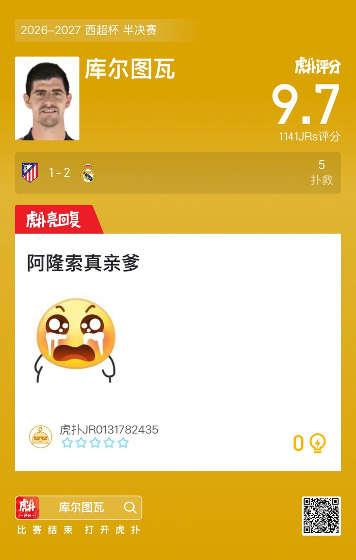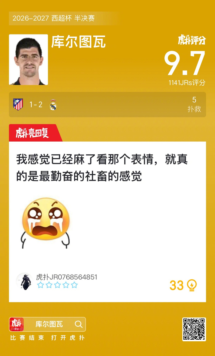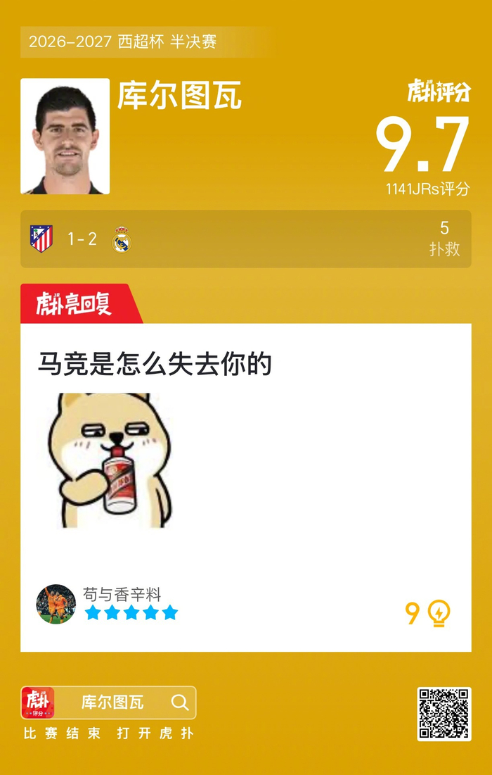 #马竞1比2皇马#库尔图瓦贡献5次扑救,赛后收获9.7的虎扑评分!