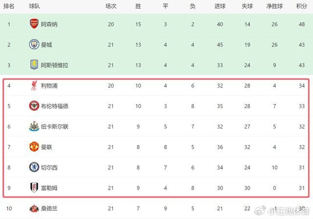 从目前来看,英超争四已经大乱,从第四的利物浦,到第九的富勒姆,这6支球队就差了3分。虽然利物浦还少赛1轮,但是他们将做客阿森纳,看起来也凶多吉少。本赛季,除了排名前三的球队之外,英超其他强队的表现,都很难让球迷满意。哪怕是夏窗斥巨资引援的利物浦,也很难保证赛季结束时,自己肯定能拿到第四名。接下来,英超争四将会更加激烈,大家认为谁能笑到最后呢!