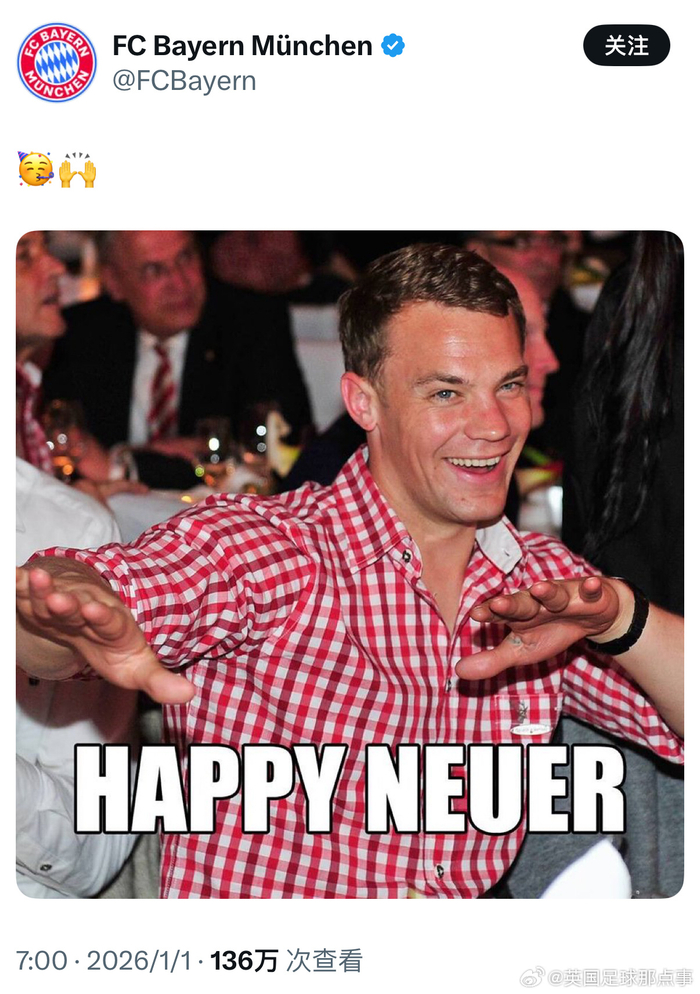 拜仁官方又把诺伊尔搬出来新年祝福了,Happy Neuer