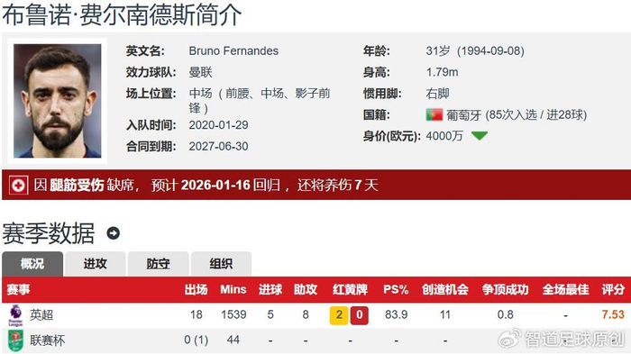 B费现年31岁,身高1.79米,右脚球员,主打前腰位置,与曼联的合同至2027年,德转估价4000万欧元,B费本赛季出战了18场英超的比赛,全部首发,其中14场踢满全场,合计出场1538分钟,打入了5个进球,送出了8次助攻。