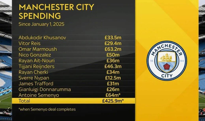 而据天空体育统计,蓝月亮在过去12个月里花费了4.25亿英镑进行引援。
