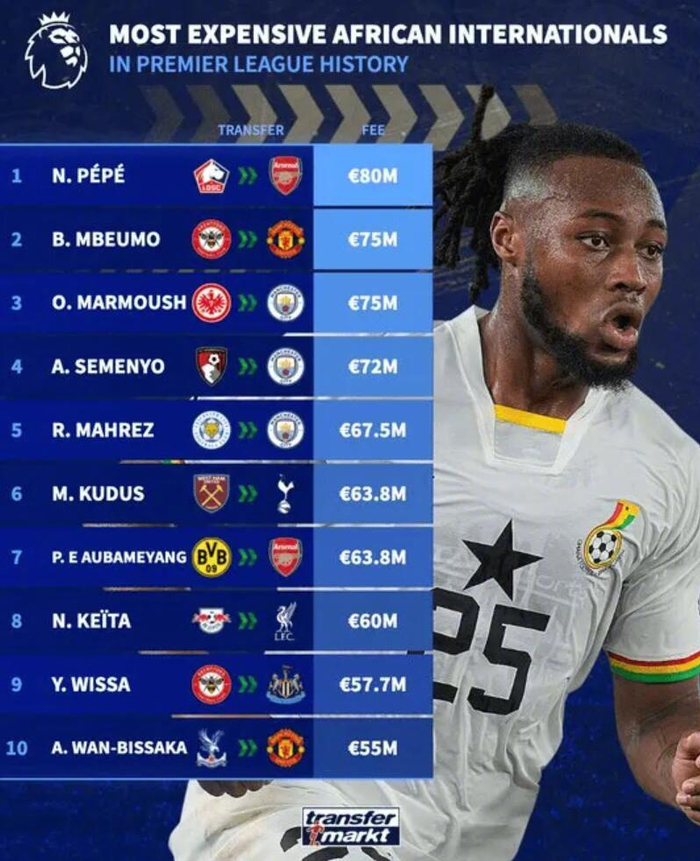 #曼城官宣签下塞梅尼奥# 德国足球市场统计了英超历史上非洲球员最贵的转会榜单。