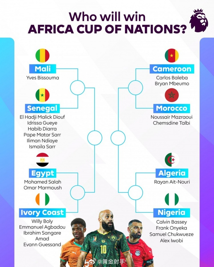 #曼城[超话]# 非洲杯1/4决赛正在进行之中,英超官方盘点了正在征战的23名英超球员,马尔穆什、艾特·努里领衔,萨拉赫、阿玛德、马兹拉维在列。