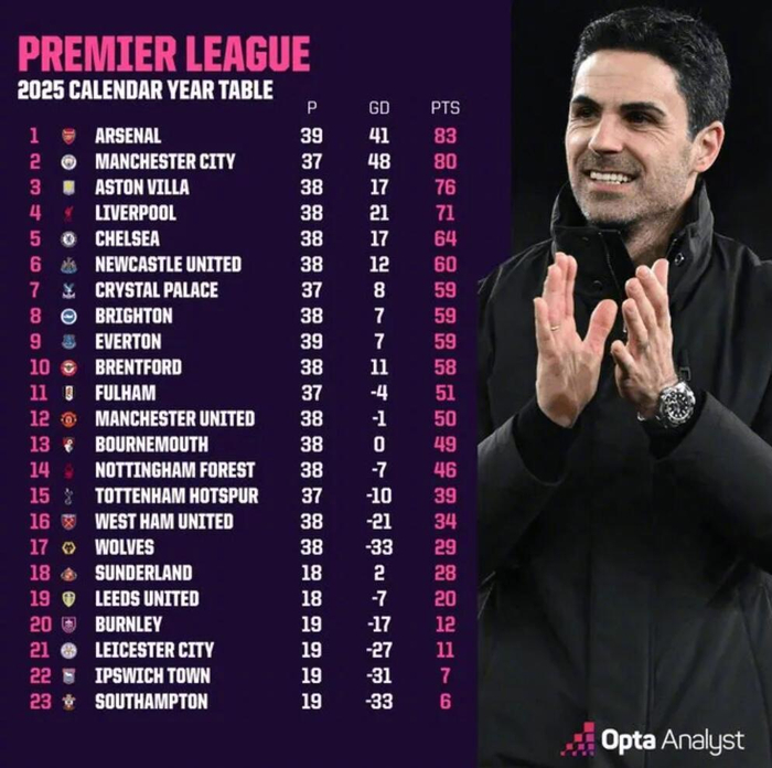 而据OPTA统计,在英超2025全年积分榜上,阿森纳39场83分高居第一,曼城少赛两场积80分排第二,维拉、利物浦、切尔西少赛一场分列三至五名。