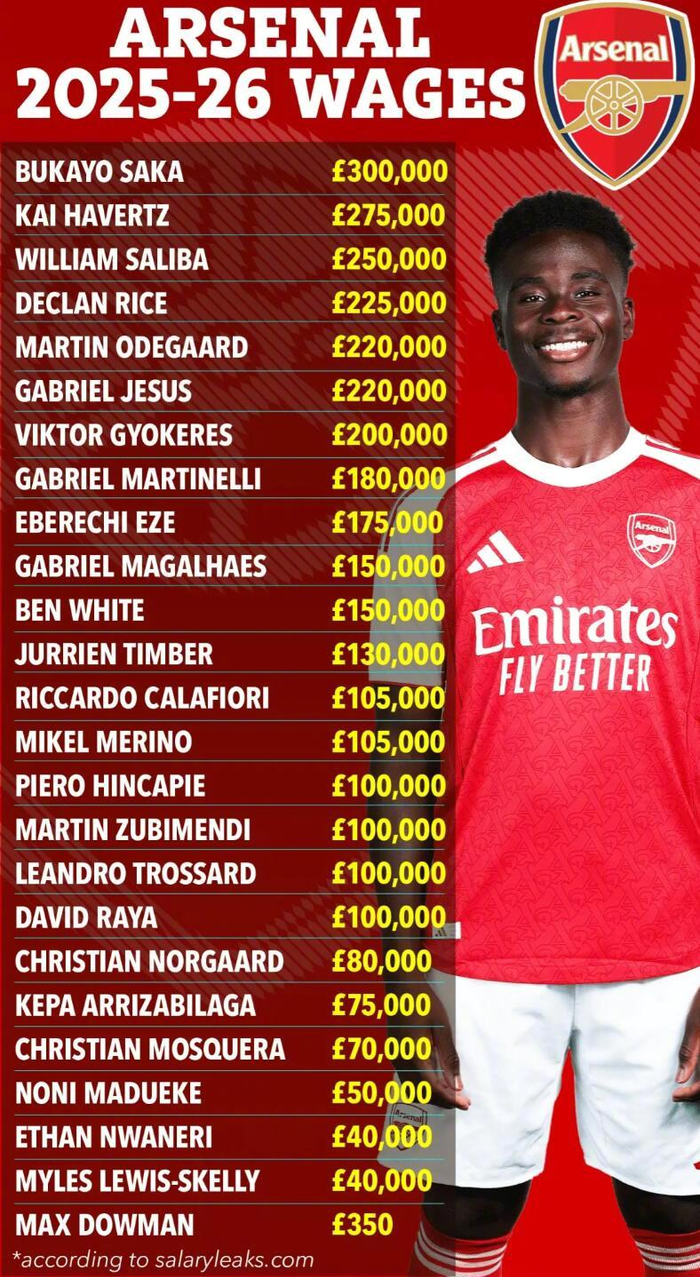 阿森纳在薪酬方面投入巨大——除萨卡外,另有六名球员周薪不低于20万英镑:哈弗茨以27.5万英镑位列第二,萨利巴(25万)、赖斯(22.5万)、厄德高与加布里埃尔-热苏斯(均为22万)以及哲凯赖什(20万)紧随其后。