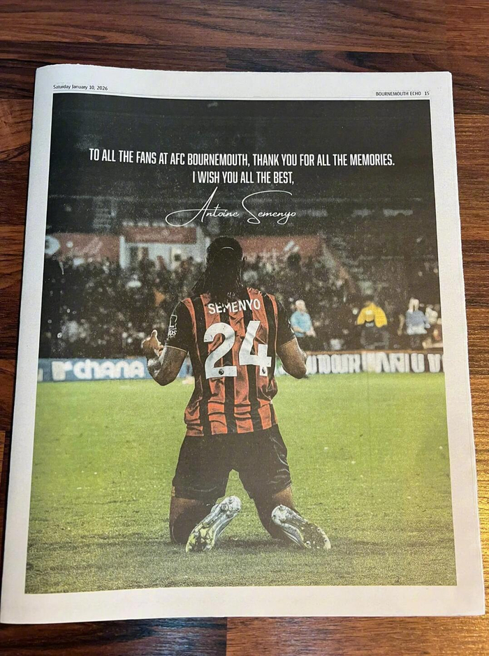 已正式加盟曼城的安托万-塞梅尼奥在今日出版的《伯恩茅斯回声报》上买下了一整个版面,以此来感谢伯恩茅斯球迷的支持,同时向球队和球迷告别。