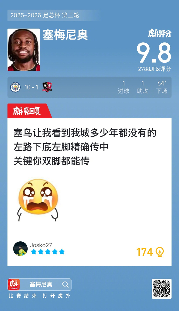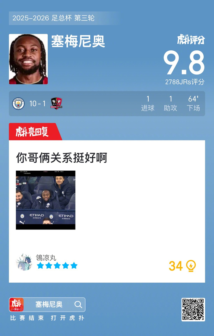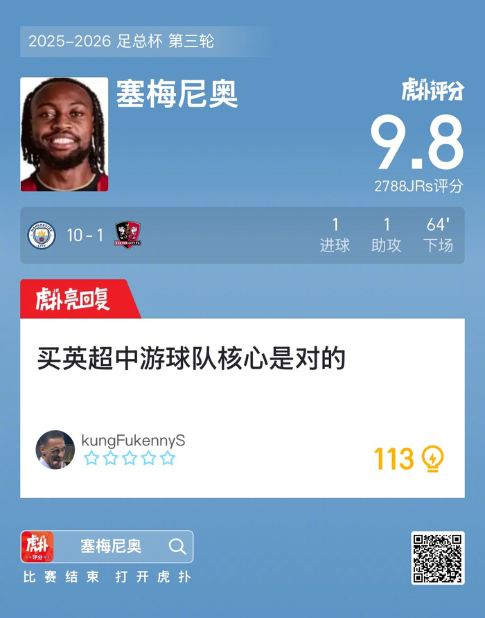 #曼城10比1埃克塞特城#塞梅尼奥打进一球贡献一次助攻,赛后收获9.8的虎扑评分!