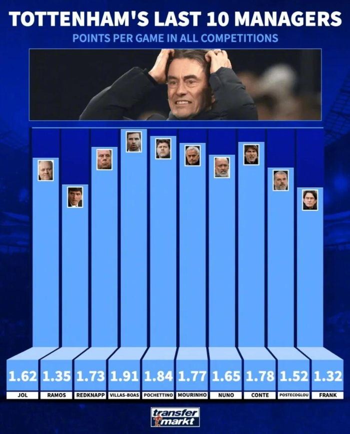 德国转会市场统计了近10任热刺主教练在各项赛事的场均积分,弗兰克的场均积分只有1.32分,为这些主帅中最低。