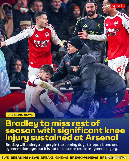 【伤停】天空体育:利物浦后卫布拉德利在对阿森纳的比赛中膝盖严重受伤,赛季报销,他将接受手术治疗,以修复骨骼和韧带损伤,但并不是前十字韧带损伤。