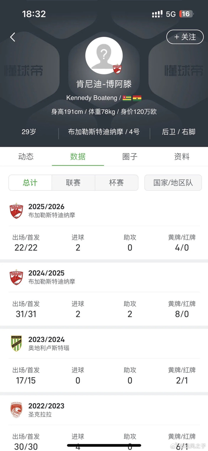 而布希里也基本被球队放弃,泰山队将引援目光聚焦在了多哥中卫肯尼迪·博阿滕身上,博阿滕今年29岁,正值职业黄金期,身高达到191cm,体型强壮,正面防守能力极为出色,是典型的中后卫“好苗子”,2023赛季,博阿滕效力于罗马尼亚甲级联赛布加勒斯特迪纳摩,他展现出了惊人的稳定性,20场比赛全部首发且打满全场,堪称球队的后防中坚。他踢球风格彪悍,在防守时犹如一堵移动的城墙,让对手难以逾越;在进攻端,他也能凭借出色的身体素质和头球能力,为球队创造机会。他甚至自称“野兽”,可见其对自身实力的自信。