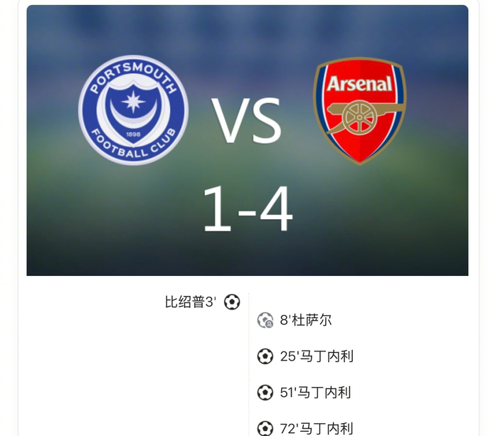 足总杯:朴茨茅斯1-4阿森纳,马丁内利上演帽子戏法!