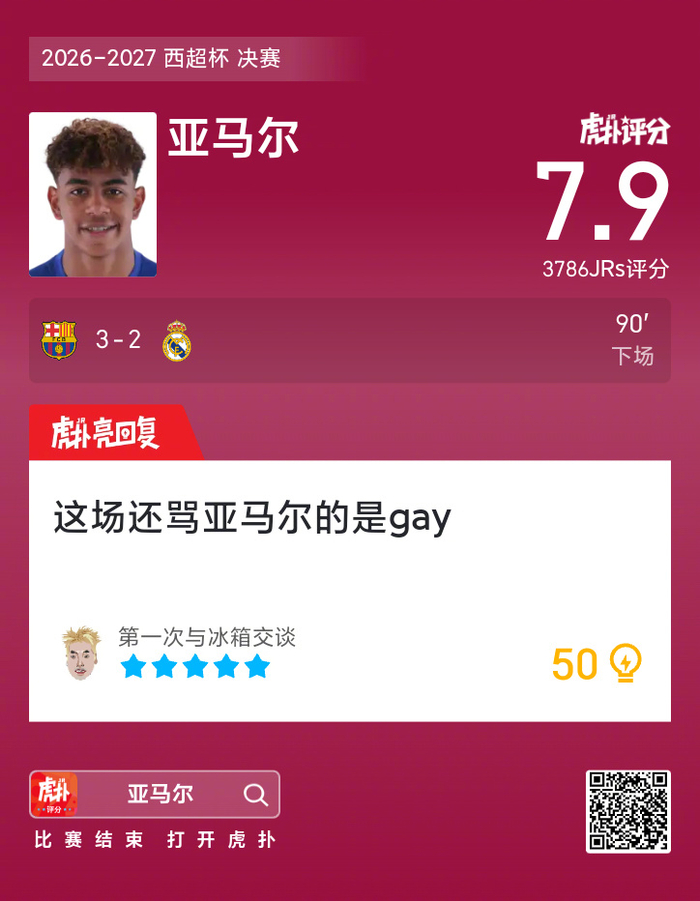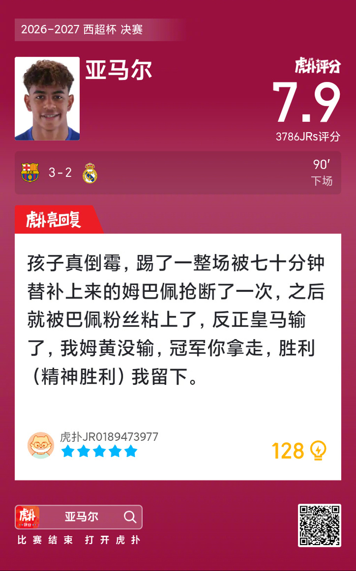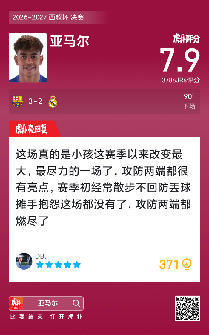 #巴萨蝉联西超杯冠军##巴萨3比2皇马# 亚马尔这场比赛的表现,你给打几分?