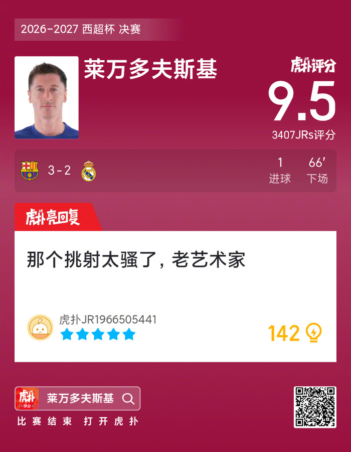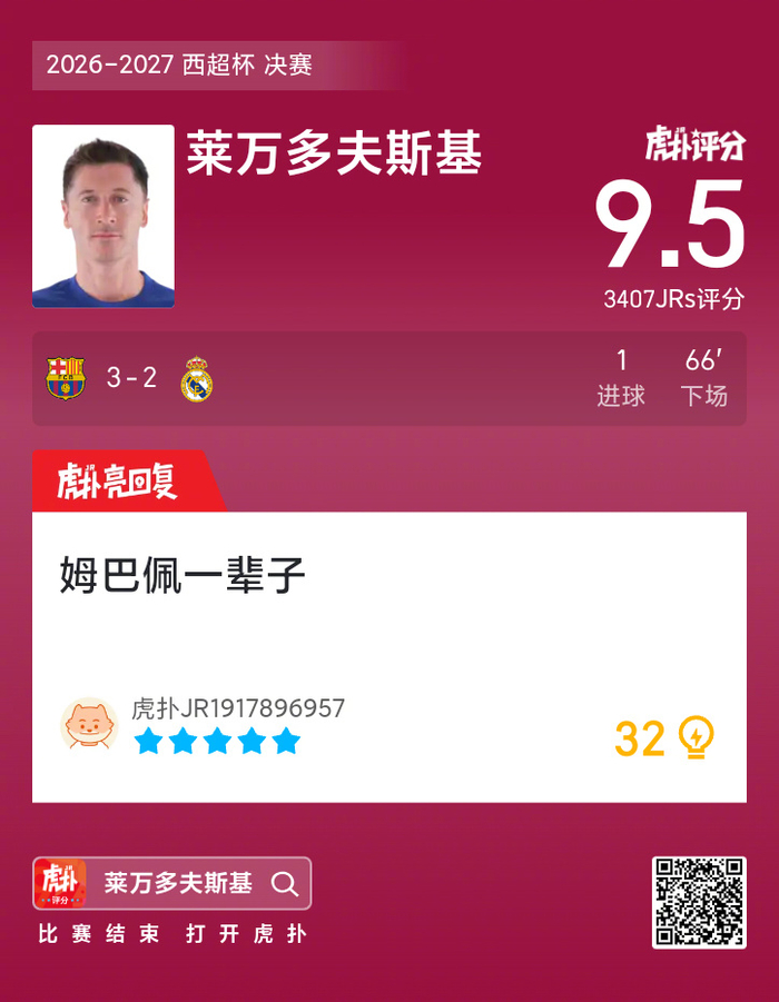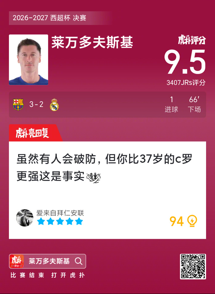 #巴萨蝉联西超杯冠军##巴萨3比2皇马# 莱万打进一球,赛后收获9.5的虎扑评分!