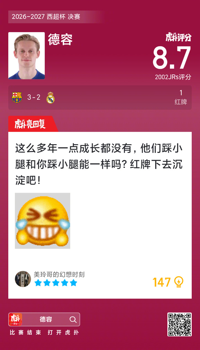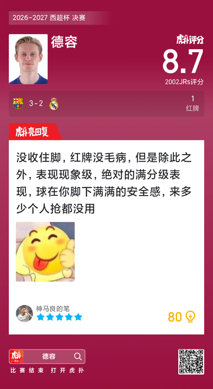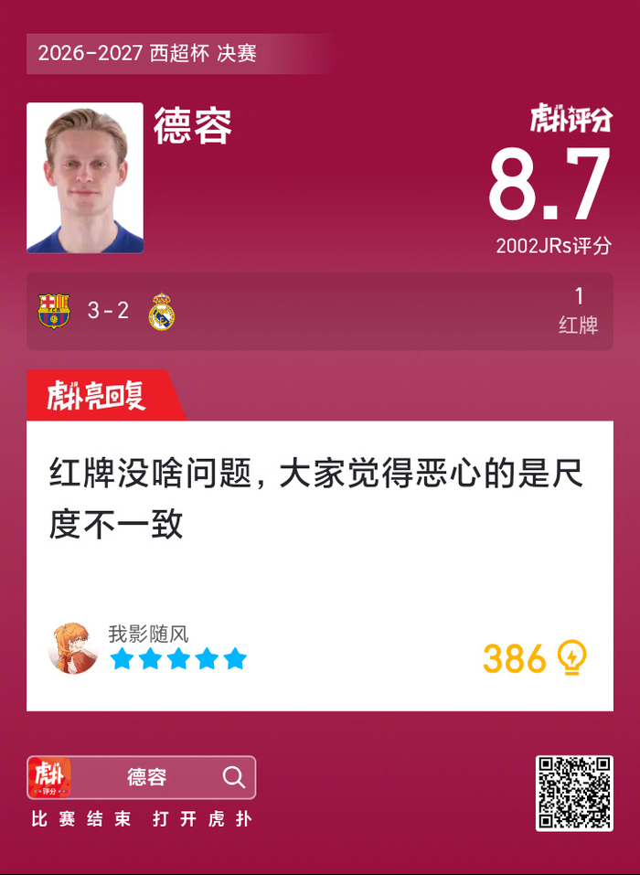#巴萨蝉联西超杯冠军##巴萨3比2皇马# 德容吃到一张红牌,赛后收获8.7的虎扑评分!