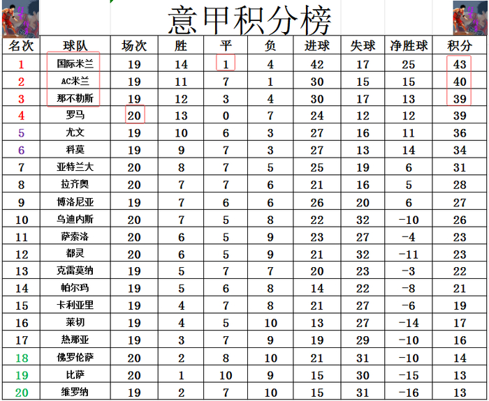 积分榜方面,随着那不勒斯绝平国米,上轮前3的争冠三强本轮都没能赢球,国米就还是3分优势力压AC米兰领跑。那不勒斯最后时刻拿到1分后,少赛一场,以净胜球优势超过罗马重回前3。
