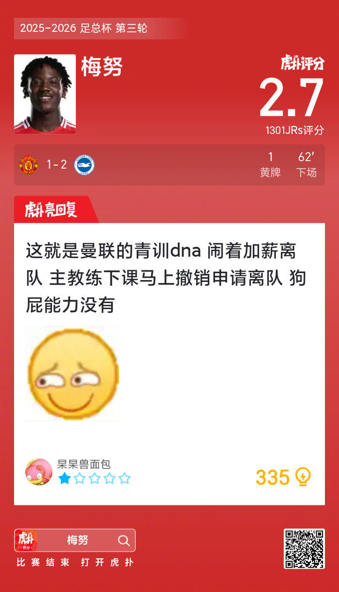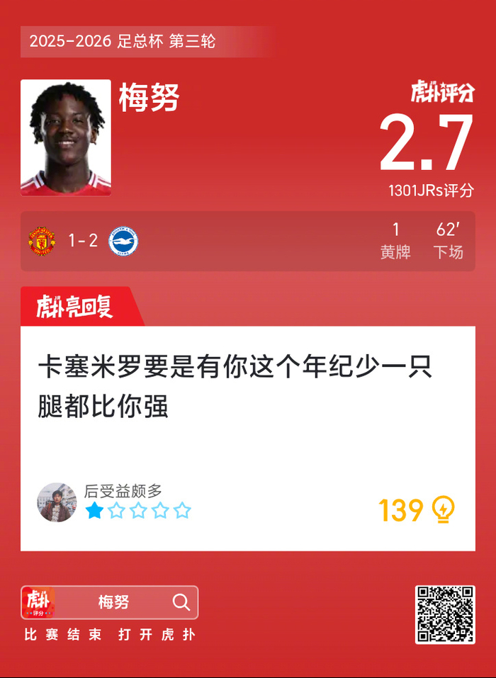#曼联足总杯出局##曼联1比2布莱顿# 梅努这场发挥如何?