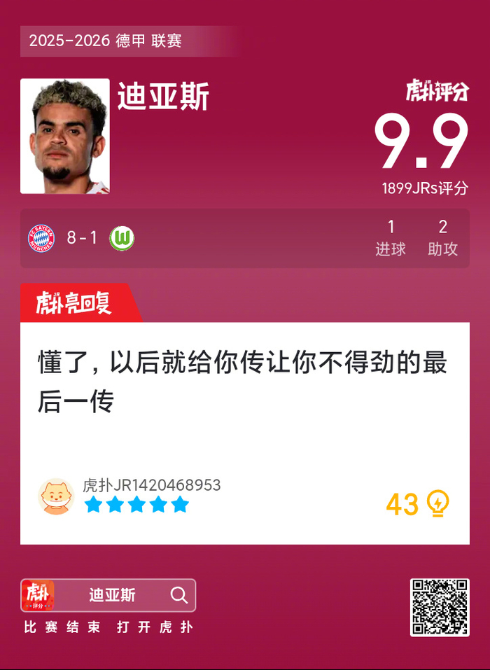 #拜仁慕尼黑8比1沃尔夫斯堡# 迪亚斯打进一球贡献两次助攻,赛后收获9.9的虎扑评分!