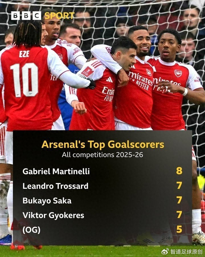 来自BBC的数据统计,本赛季各项赛事至今,没有任何英超球队从乌龙球中获益超过阿森纳,并列出了一份阿森纳队内射手榜,其中乌龙球排名第五。