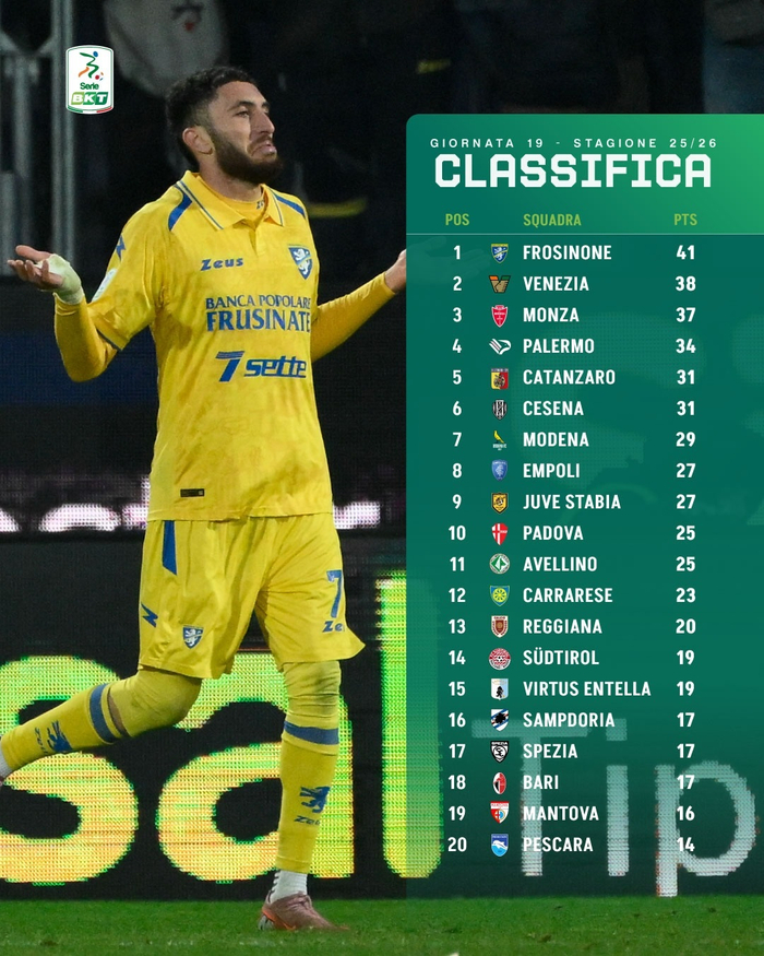 👉 由斯特罗帕🇮🇹教练执教的威尼斯队以11胜5平3负积38分,排名升至↑第2位;