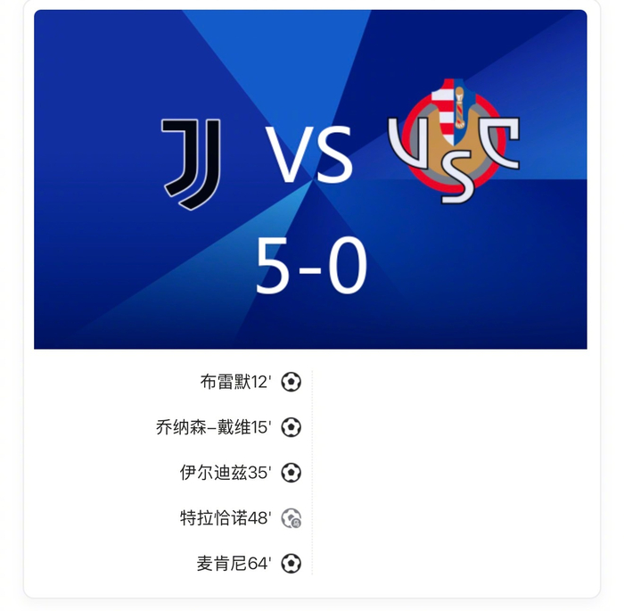 战报:#尤文图斯5比0克雷莫内塞#,戴维、伊尔迪兹建功!