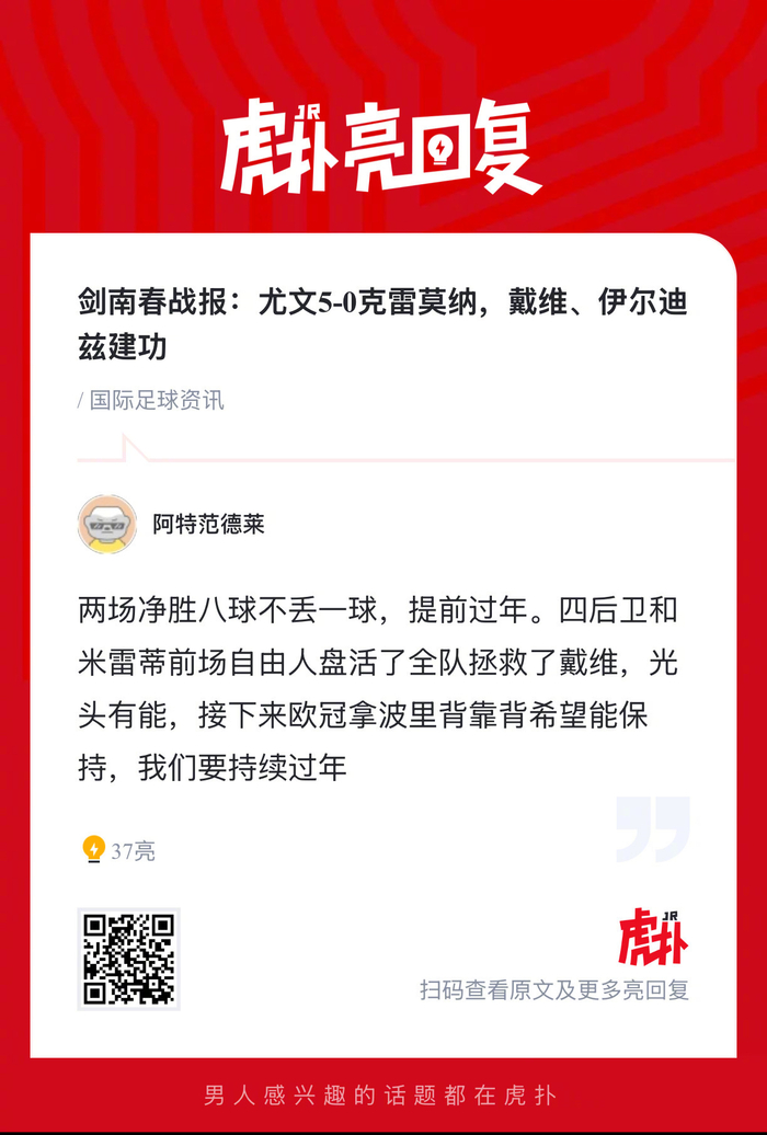 上半场布雷默折射破门;戴维反击推射扩大领先;伊尔迪兹点射中柱,补射建功。下半场麦肯尼再造2球,帮助尤文大胜。