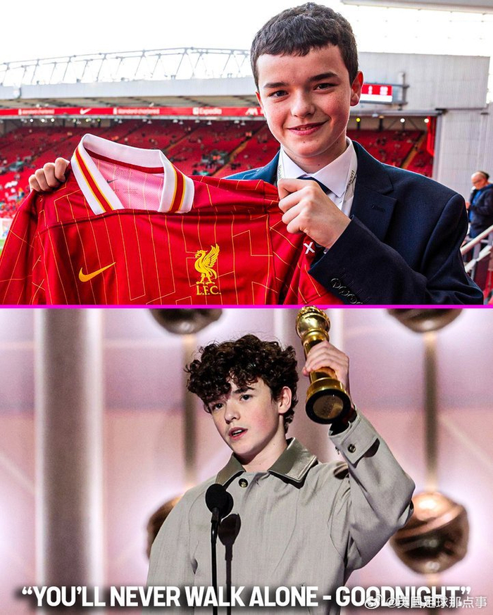 利物浦球迷欧文·库珀在金球奖获奖感言环节用队歌“你永远不会独行”结尾❤️16岁的库珀凭借《混沌少年时》荣膺电视类最佳男配角,成为奖项史上最年轻得主