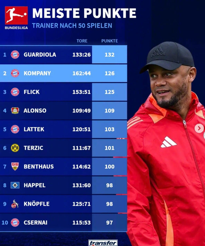 孔帕尼获得了126分,仅次于瓜迪奥拉执教拜仁前50场获得的132分。弗里克以125分排名第三。
