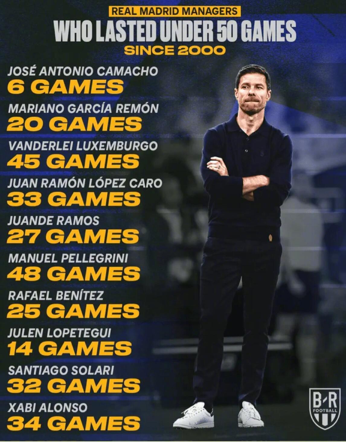 #皇马解雇阿隆索# 根据B/R Football的统计,阿隆索是本世纪第十位执教皇家马德里不满50场即黯然下课的主教练: