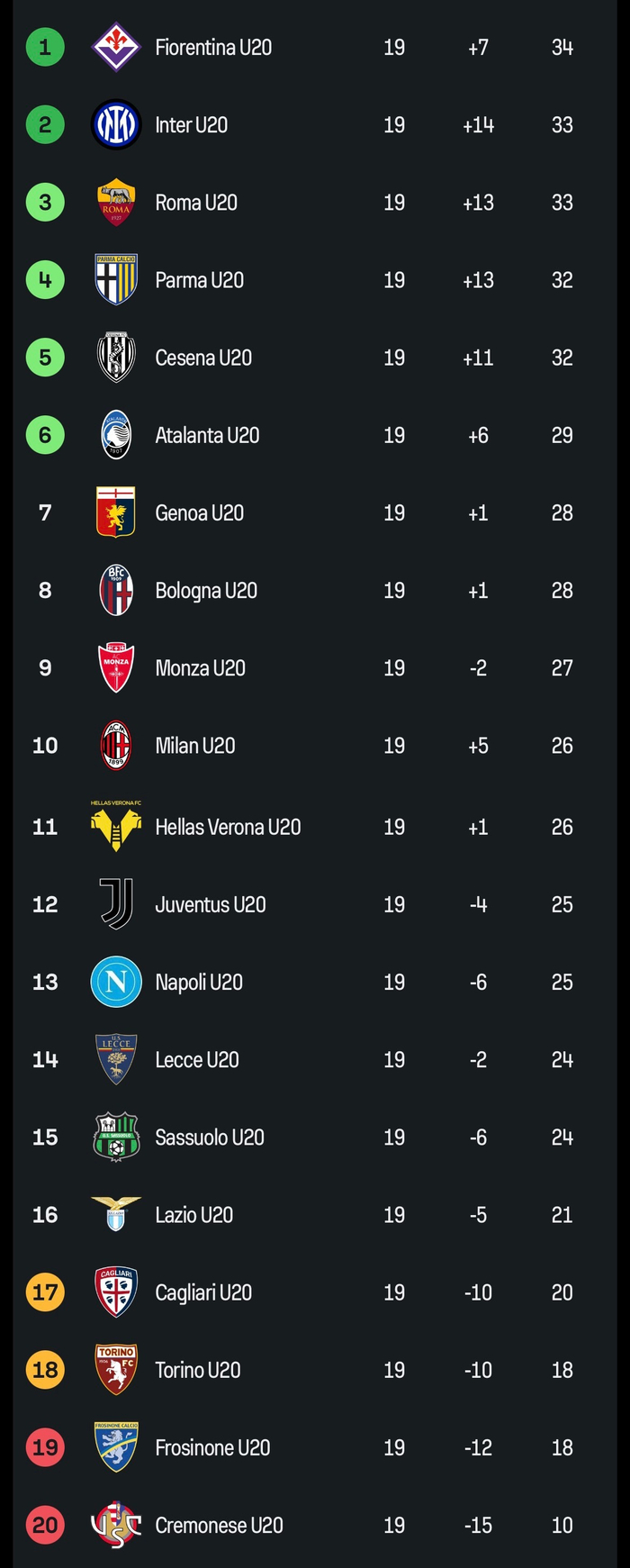 【预备队积分榜】2025-26赛季#意甲# 预备队联赛第19轮积分榜: