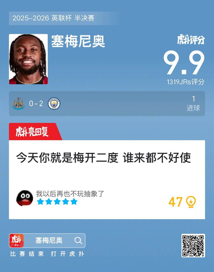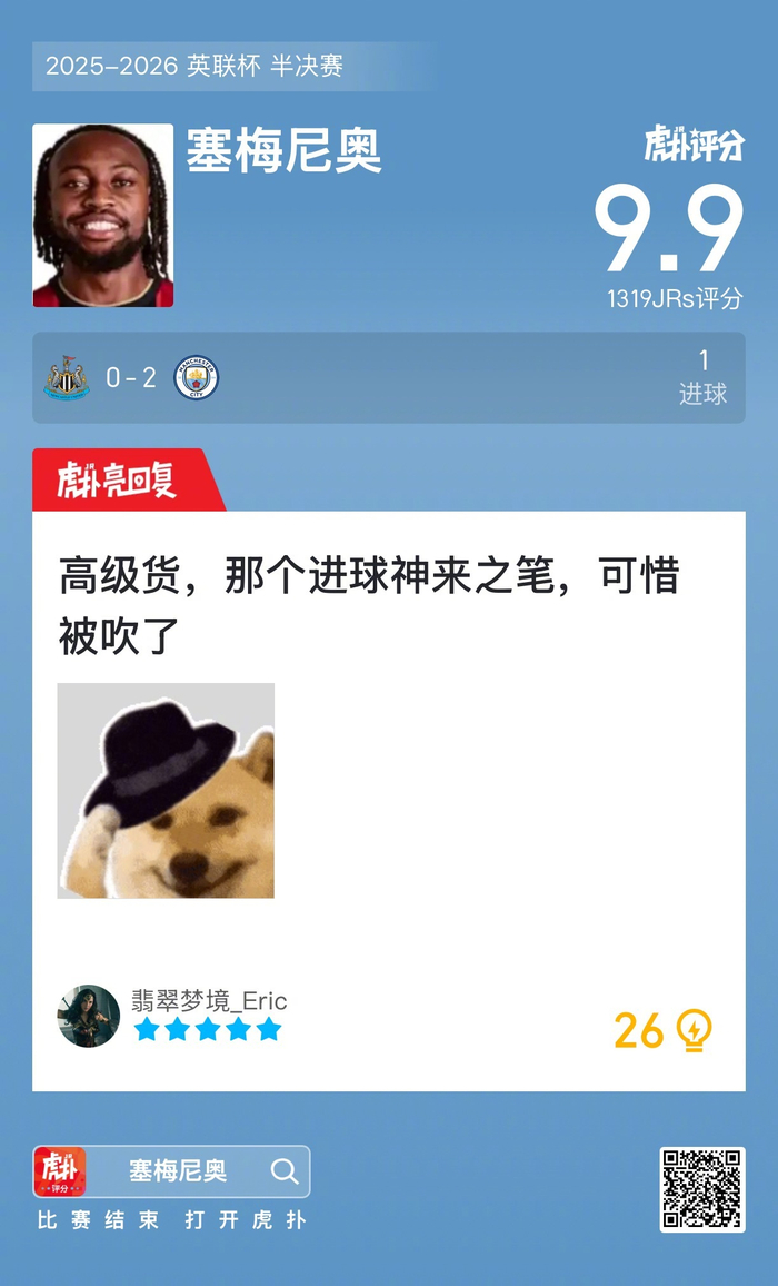 #纽卡斯尔联0比2曼城# 塞梅尼奥打进一球,赛后收获9.9的虎扑评分! 这表现你们怎么吹?