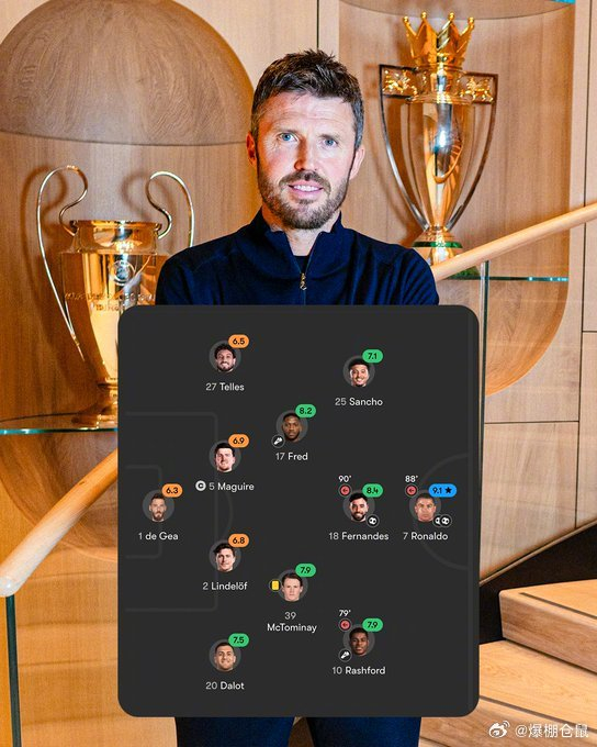 【#卡里克出任曼联主帅# 】上一次他担任红魔临时主教练的首发:德赫亚,达洛特,林德洛夫,马奎尔,特莱斯,麦克托米奈,弗雷德,拉什福德,布鲁诺-费尔南德斯,桑乔,C罗。