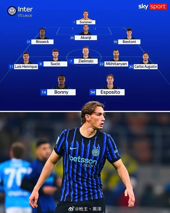 齐沃大幅度轮换!意甲联赛第16轮补赛国际米兰明天凌晨对阵莱切,天空体育预测国际米兰首发阵容,这次轮换力度很大,劳塔罗和图拉姆全部替补,黑旋风博尼和埃斯波西托首发。恩里克连续第11场首发,不被看好之人在苦苦支撑国际米兰右路,铁人值得尊敬。巴雷拉和迪马尔科替补席待命,苏西奇和美男子奥古斯托首发。