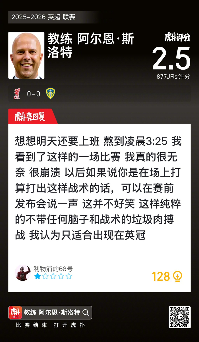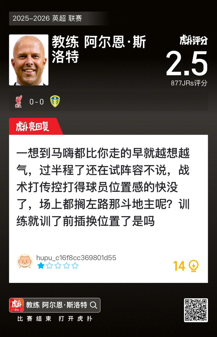 #利物浦0比0利兹联# 斯洛特赛后收获2.5的虎扑评分!