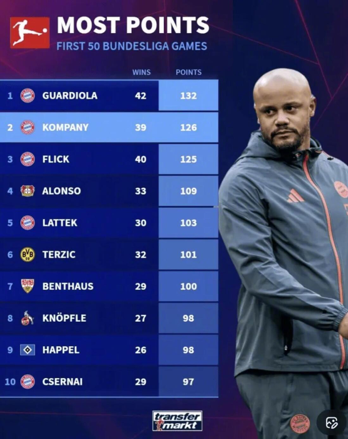 根据德国转会市场的统计,孔帕尼是德甲联赛历史上执教前50场获得积分第二多的教练,仅次于瓜迪奥拉。