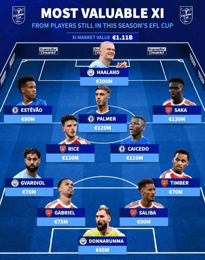 德国转会市场盘点了本赛季英格兰联赛杯四强球队的最贵阵容,详情如下: