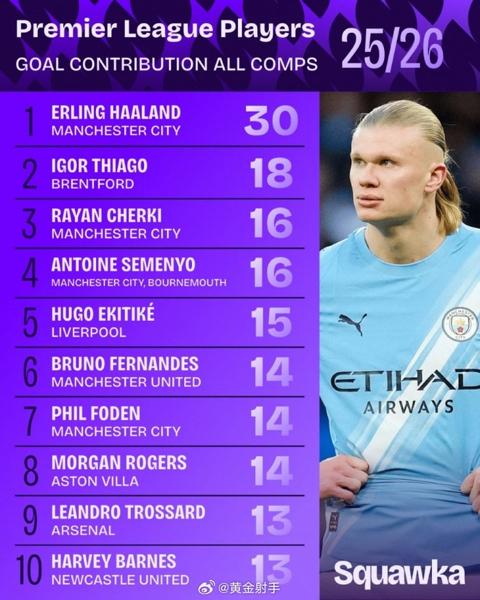#曼城[超话]# Squawka统计了本赛季英超球员各赛事的参与进球数量,并列出榜单,哈兰德参与30球断层居首。