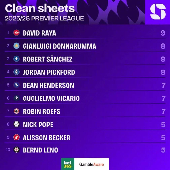 在英超第19轮比赛过后,英超的门将零封榜也再度更新。目前的榜单如下: