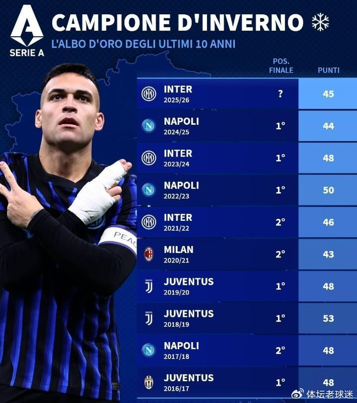 此役胜利后,国米以46个积分成为本赛季意甲半程冠军。媒体更是列出一项值得玩味的数据,那就是过去10个赛季的意甲半程冠军中,其中有6队最终成功捧起意甲桂冠。