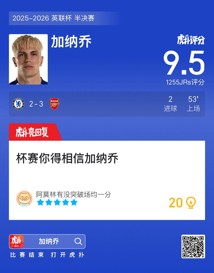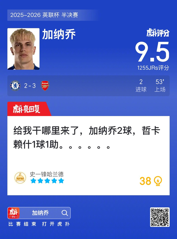#切尔西2比3阿森纳# 加纳乔打进两球,赛后收获9.5的虎扑评分!这表现你觉得如何?