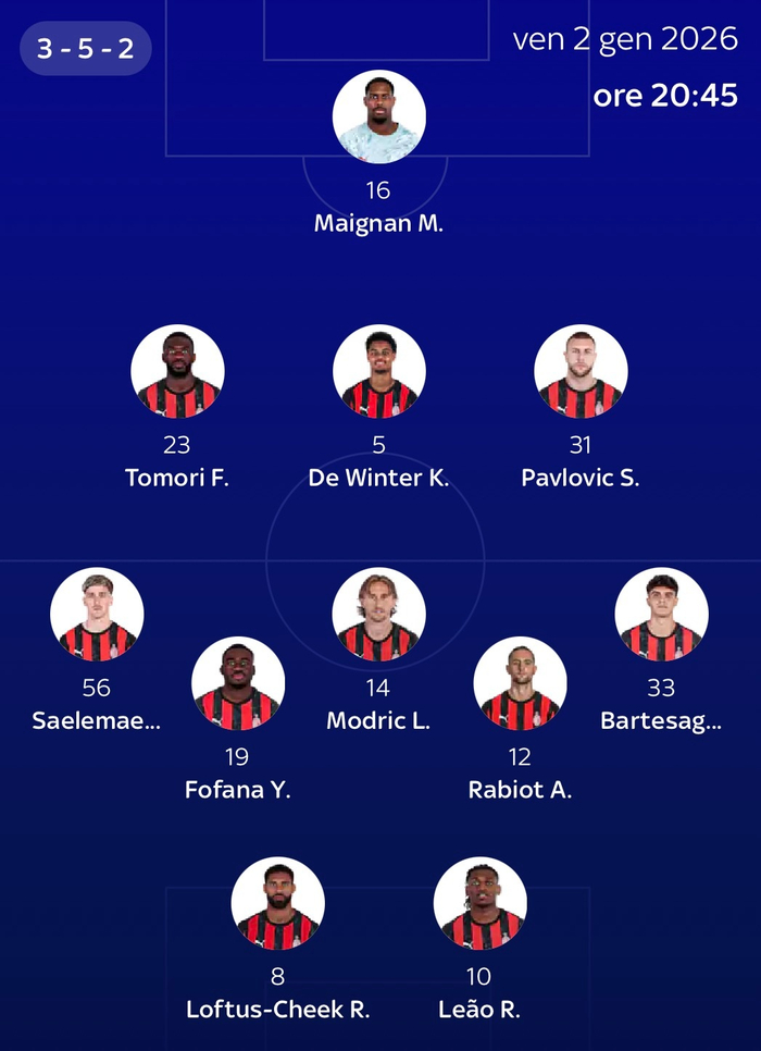 【Sky】该媒体更新了2025-26赛季#意甲联赛# 第18轮 -🔴⚫️米兰客场对阵卡利亚里队「最新预计首发阵容」(352):