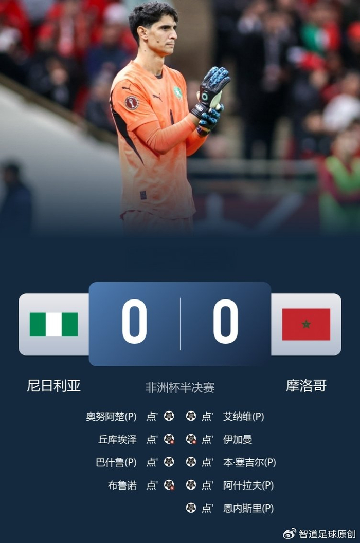 非洲杯另一场半决赛,尼日利亚0-0战平摩洛哥,双方进入点球大战,布努两次成功扑点,阿什拉夫、恩内斯里均成功主罚点球命中,帮助摩洛哥淘汰尼日利亚晋级决赛。